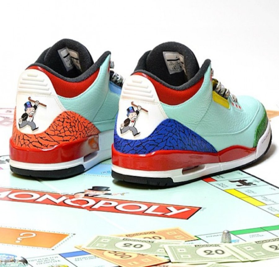 来源于 FreakerSNEAKS 的精彩作品,以经典的桌游 Monopoly 地产大亨为灵感来源,在 Air Jordan 3 鞋型上采用多彩鸳鸯配色点缀爆裂纹装饰,后跟则以标志性的 Rich Uncle 形象替换 Jumpman Logo,鞋带也以游戏中纸币的形象展现。