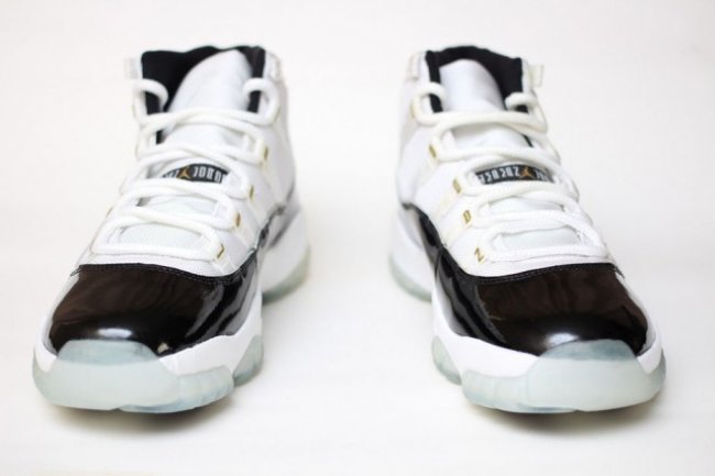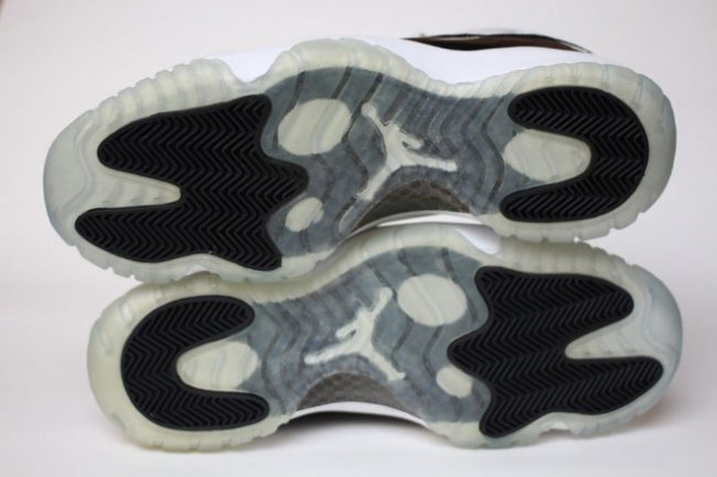 同 Air Jordan 11 DMP 一样,眼前这款黑白 Concord 配色的 Air Jordan 11 在鞋帮上同样采用了金黄色的 Jumpman Logo,但颇为不同的是在鞋带扣上,装饰由字母 JORDAN 组成的金属饰品,在白色的背景上显得十分抢眼。