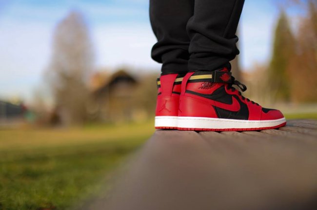 Jordan Brand 30 周年来临之际,经典的高帮加固带版本的 Air Jordan 1 High Strap 也将有多款新配色发售。今天带来黑红 Bred 配色的上脚实拍,皮革鞋身,运用经典的黑红双色打造,鞋帮带有稳固绑带。