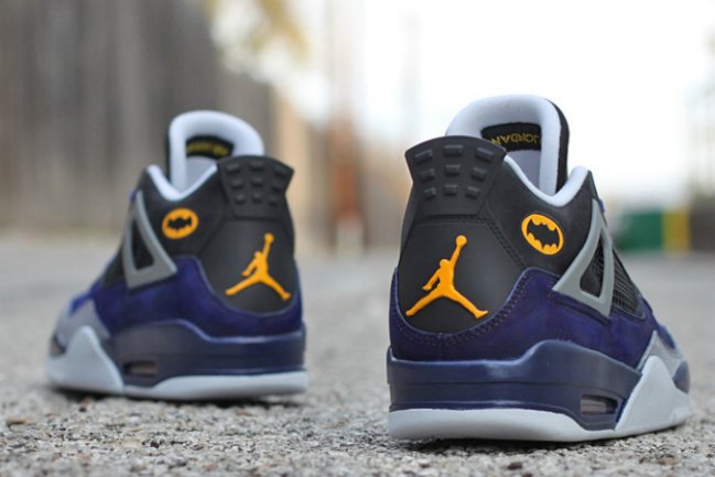 Dank Customs 出品,必属精品。以 BATMAN 蝙蝠侠的战衣为灵感来源,采用紫黑灰三色拼接打造鞋面,而鞋帮和鞋舌都以经典的蝙蝠侠黑黄色 Logo 呈现,后跟 Jumpman Logo 的黄色点缀也颇为抢眼。