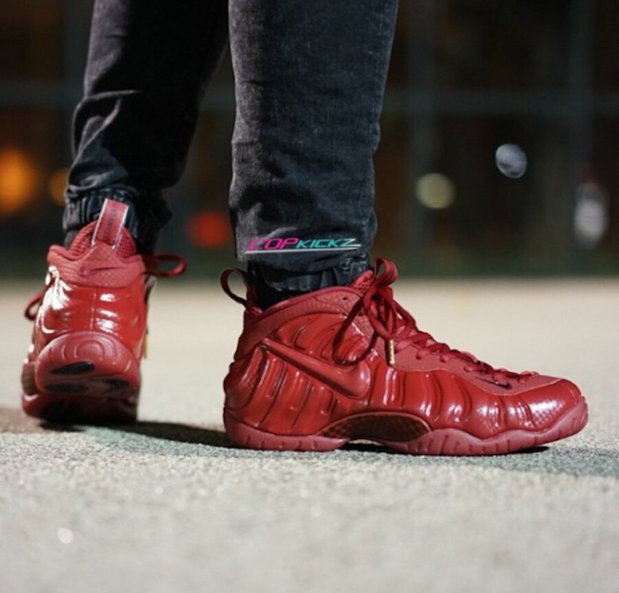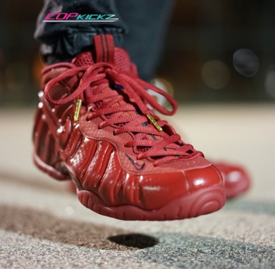 带来 Nike Air Foamposite Pro “Red October” 上脚实拍,以红色碳纤维纹路的发泡鞋面呈现,点缀金黄色鞋带头,呈现出红色十月的奢华感受,将于 4 月份正式发售。 货号:624041-603 发售日期:4 月