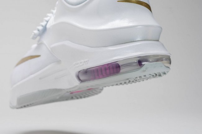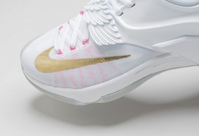 KD7 “Aunt Pearl” 以纯净的白色鞋身点缀抢眼的金黄细节,天使飞翼造型的魔术贴给此鞋款增添了不少亮点。 作为 KD 系列的 Kay Yow 抗乳腺癌配色,Aunt Pearl 配色旨在向杜兰特因癌症去世的阿姨寄托哀思,魔术贴内侧的文字和后跟的 Kay Yow 粉红丝带标志表明了它的身份。 将于 2 月 19 日正式发售,发售价 $170 美元。 货号:706858-176 发售日期:2 月 19 日
