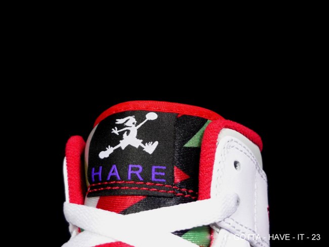 经典的 Hare 配色再现,鞋舌则以兔八哥飞人 Logo 和 HARE 字样呈现,后跟也带有 HARE 字样,附带赠送的兔八哥鞋卡则在乔丹经典造型的基础上做了有趣的替换。