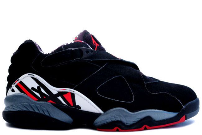 这双 Air Jordan 8 Low 黑红,基本上为 Air Jordan 8 季后赛的低帮版本。你能发现一点和高帮版本不同的就是,这双低版版本的 Air Jordan 8 Low 的内侧接线为多彩的配色。但是这双球鞋因为低帮设计而没有像高帮版本那样给予脚踝最够的保护,使得这双球鞋变成了球场上的错误选择,不过出街的话还是非常不错的选择。