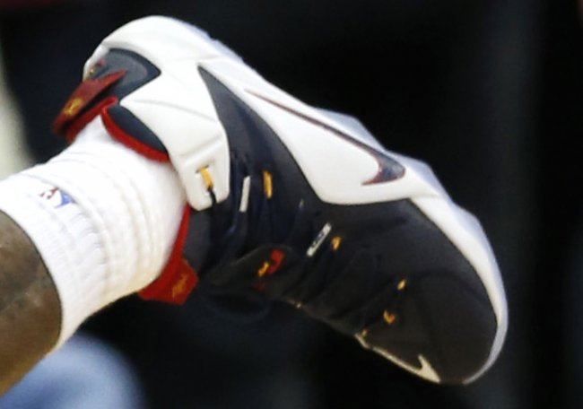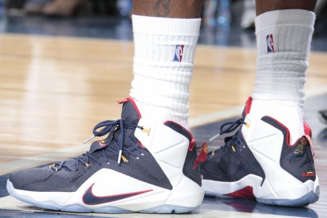 在昨天对阵小牛的比赛中,骑士队穿着了海军蓝色的球衣,詹姆斯斩获 27 分 7 个篮板 8 个助攻,上脚了一款同球衣颇为映衬的 LeBron 12 PE。采用海军蓝 Megafuse 搭配白色的 Posite 材质,红色和黄色的细节装扮则同球衣细节不谋而合。