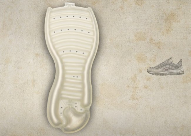 1997年,在生产、发展和设计工作的全面支持下,如何制作全掌Air-Sole的密码被破解了。首先是创建一个相互关联的鞋跟和前脚单元。接下来的任务是如何能兜住足够长的融膜,从而闭合全掌长度的三维模型。在经过了数次原型设计和一次飞跃之后,Air Max 97诞生。