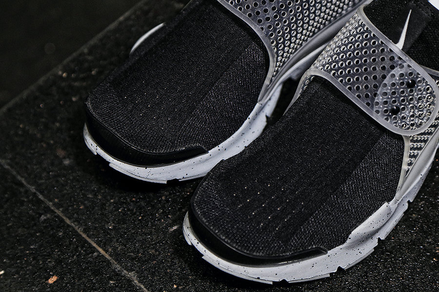 fragment design x Nike Sock Dart SP 联名精品迎来第四款配色的亮相,此款 Genealogy Pack 回归简洁的黑白双色,黑色鞋面搭配白色中底,而泼墨装扮给整体注入动感活力,避免了纯白大底带来的单调感受。 鞋身细节的设计颇为细腻,在街头潮流感十足的同时,也值得细细的品味。