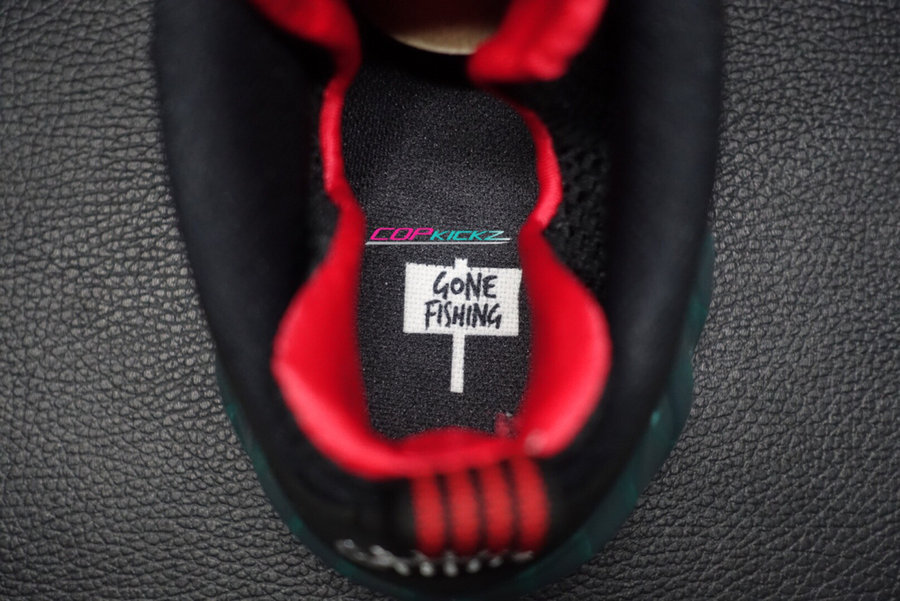 NSW 以外出钓鱼为主题,打造了这双颇具趣味的钓鱼喷 Nike Air Foamposite One “Gone Fishing”。已经多次曝光实物图片,此番我们带来全新的清晰图赏。 带有 3M 反光效果的鱼鳞纹发泡鞋面,搭配黑色鞋领,细节采用红色点缀,后跟附有鱼骨刺绣标志,鞋垫上的 GONE FISHING 路牌也颇为契合主题。将于 6 月份限量发售 8000 双,目前尚无确切的发售日期,我们将持续关注。 货号:575420-300 发售日期:6 月