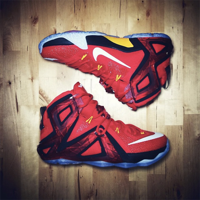 LeBron 12 Elite 精英版球鞋首发配色实物曝光,延续了 LeBron 12 常规版鞋款的鞋身设计,在 Megafuse 鞋面基础上,以更加轻量级的镂空硬质材质提供支撑,鞋带也从硬质材质上贯穿,同样的水晶大底,同样颇具攻击感受。首发配色以红色为主色调,搭配黑色细节,点缀黄色的动态飞线。