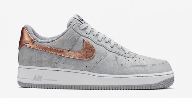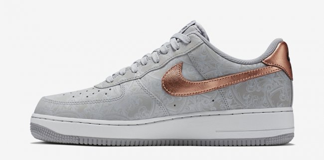 经典鞋型 Nike Air Force 1 Low 发售新款配色系列,以灰色作为主色调,鞋面上呈现出巴洛克风格图纹,Swoosh 和后跟以金属铜色呈现,凸显奢华的点缀效果,货号为 718152-004,已经登录 Nike 店铺发售。