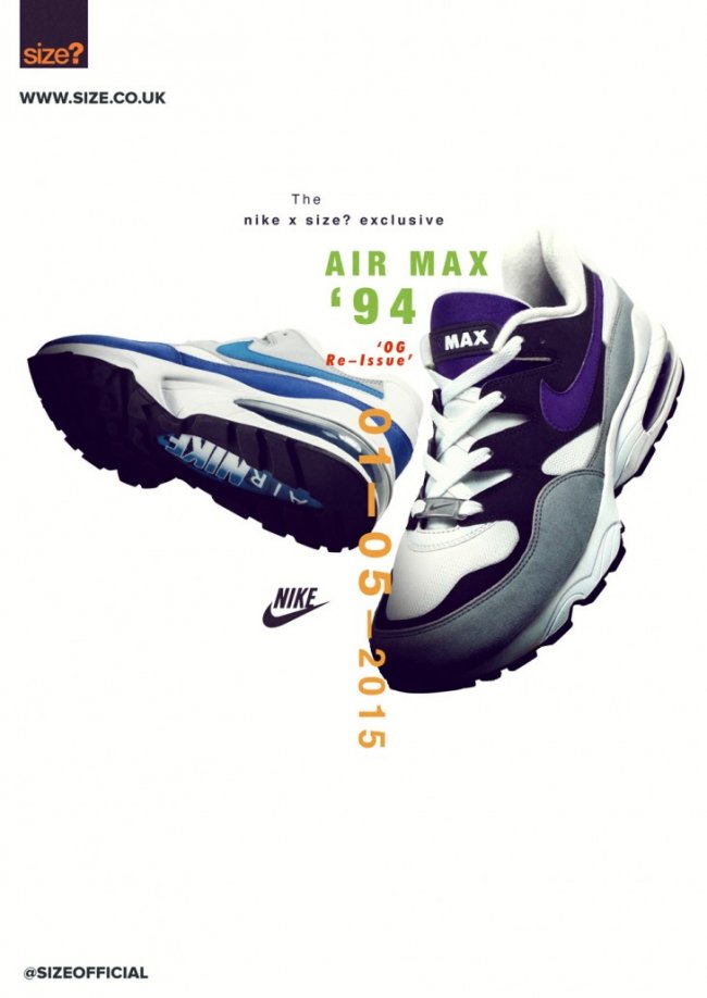 Size? 依然不予余力的将 Nike 复古跑鞋带回到我们眼前,继 Air Max ’93 OG 的回归后,此番 Size? 即将携手 Nike 将 Air Max ’94 OG 多款配色再现呈现。蓝白灰配色和白黑灰配色将于 5 月 1 日正式发售。