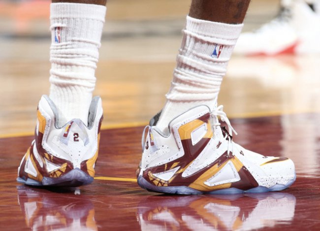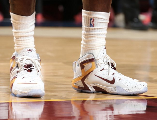 坐镇主场的骑士队在今天以 92:99 不敌势头凶猛的公牛,詹姆斯拿下两双,脚上穿着了一款全新配色的 LeBron 12 Elite PE。 以白色作为主色调,细节以泼墨装扮呈现,硬质材质部分则以黄色和红色搭配,呈现出骑士球队配色。