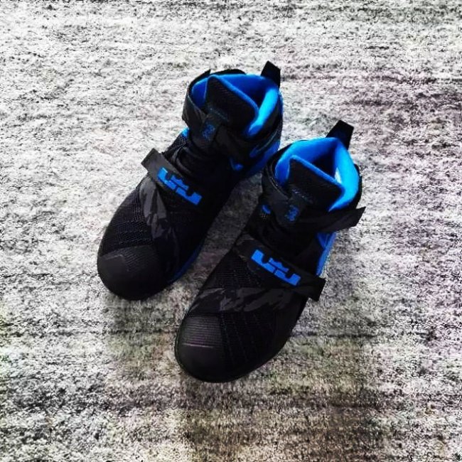 詹姆斯实战支线球鞋产品士兵系列新成员即将登场,已经有多款配色亮相,继昨天带来的军事迷彩风格后,今天一款黑蓝配色的 Nike Zoom Soldier 9 也曝光了实物。 以黑色的 Hyperfuse 面料打造鞋面,辅以蓝色的细节和鞋底,鞋身 Swoosh 采用白色打造,简单的 3 色搭配,带来抢眼的反差效果。