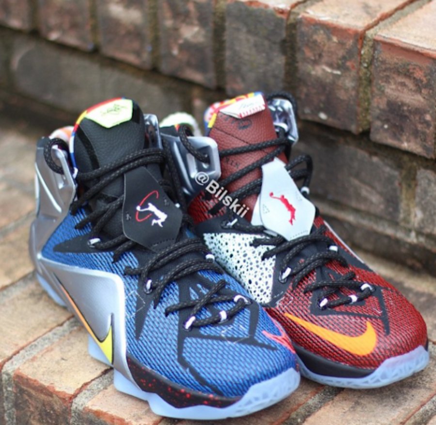 LeBron 12 “What The” 延续了 WTL 系列一贯的非对称夸张设计,将多个元素和色彩融合。此番的呈现,分别以蓝色和红色 Megafuse 材质作为主体打造鸳鸯色氛围,鞋舌选用皮革材质,Dunkman 和 Swingman Logo 在左右鞋上呈现,而红色左鞋上融入了 Safari 材质图纹较为抢眼。