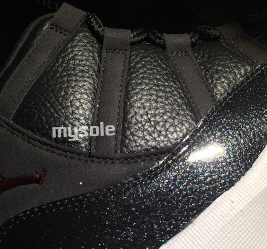 整体以深色鞋身搭配浅色的鞋底,熟悉的网布面料被荔枝皮革和麂皮所替代,经典的漆皮装扮也以多彩光泽呈现,鞋帮上的 Jumpman Logo 则以金色质感的贴片方式替换了原有的刺绣方式。整体黑白搭配点缀红色细节,以十足的质感重新诠释了 Air Jordan 11 鞋型的魅力。