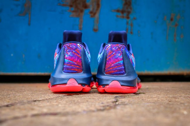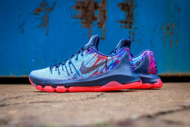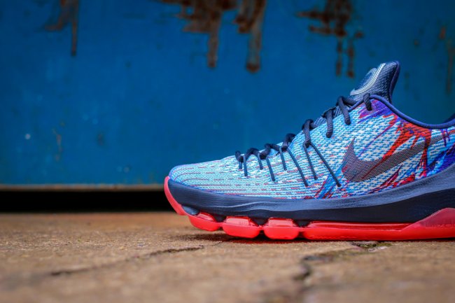 尚未正式官方发布的 Nike KD8 加入了 Nike Basketball 在今年的美国独立日系列。眼前这款 KD8 美国独立日配色在 Mesh 鞋面上以红蓝泼墨装扮营造出美国国家配色氛围,搭配藏青色中底和鞋舌,红色外底的托衬颇为抢眼。或将在 6 月 27 日正式发售,也可能是 KD8 首款市售的配色,有兴趣的朋友请关注。