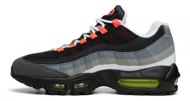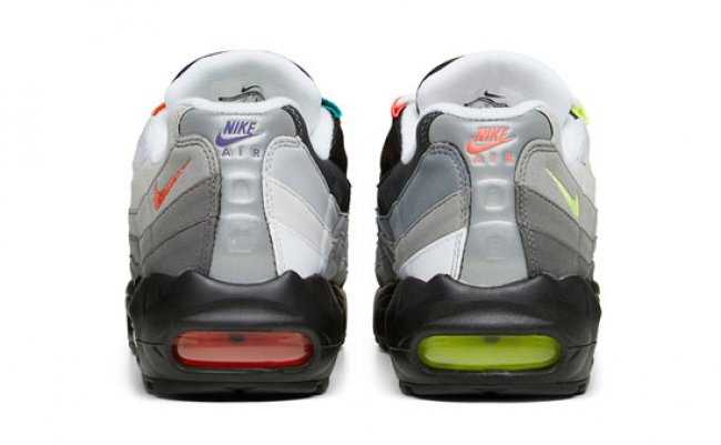 以 OG 元年配色 Nike Air Max 95 “Neon” 为蓝本,将本系列多个配色的经典色彩在鞋身上不对称呈现,将 AIr Max 95 鞋身完美的线条设计展现的淋漓尽致。以回忆纪念为主题,凸显活力为基调,What The 配色的不对称夸张呈现,也给 20 周年的 Air Max 95 注入了全新活力。