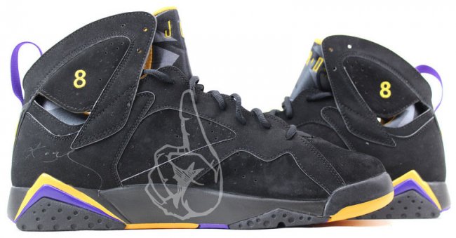 一款专为科比打造的 Air Jordan 7 PE 款球鞋亮相,采用黑色麂皮鞋面,细节点缀湖人队标志性的紫色和黄色,鞋帮上的数字 8 刺绣则表明了它的身份。这双球鞋整体质感十足,而湖人队元素的呈现在带来亮点的同时,也另科比粉丝和湖人球迷倍感亲切,但目前高达两万五美元的售价也显得不那么亲民了。 这款球鞋也诞生于科比的乱穿鞋阶段,有兴趣的朋友可以点击查看更多相关内容。