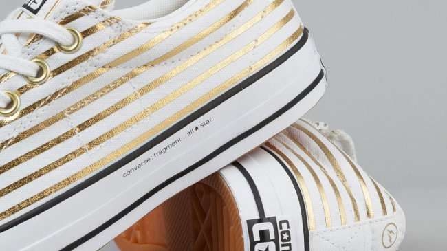 fragment design 的联名之作开始覆盖 Converse 鞋款,此番选用 Converse Cons CTAS Pro 打造的联名鞋款已经曝光过谍照图片,现在带来白金条纹配色的实物图片。 白色帆布鞋身搭配白色硫化大底,鞋面采用金色条纹覆盖,后跟的闪电标志表明了它系出 fragment,鞋底外侧也有 converse:fragment 字样。 目前尚无明确发售信息,我们将持续关注。