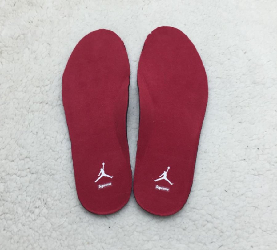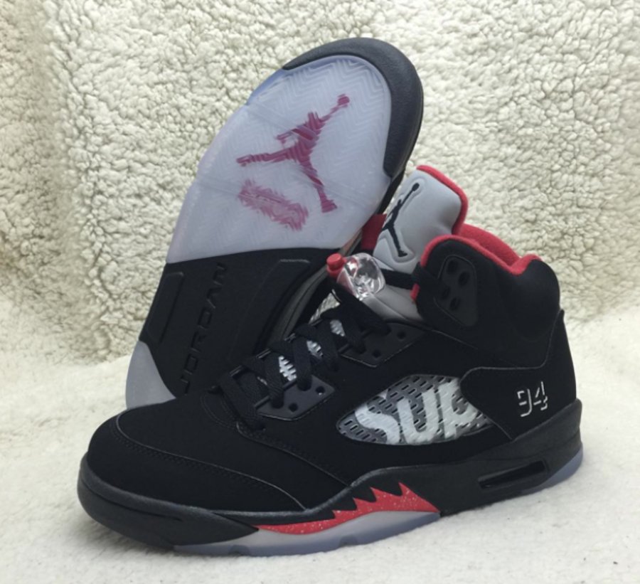 以黑色牛巴革鞋面呈现的 Supreme x Air Jordan 5 “Black” 带来不一样的质感和潮流气息,经典的 Air Jordan 5 氛围更加浓厚,黑色鞋面搭配 3M 反光鞋舌,中底的红色喷炎装扮起到了画龙点睛的效果。鞋帮 94 刺绣和 Sup 字样则表明了 Supreme 的特别身份。