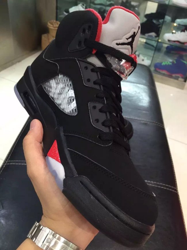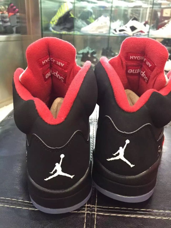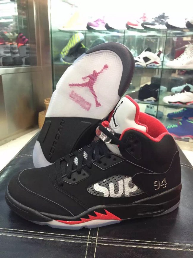 以黑色牛巴革鞋面呈现的 Supreme x Air Jordan 5 “Black” 带来不一样的质感和潮流气息,经典的 Air Jordan 5 氛围更加浓厚,黑色鞋面搭配 3M 反光鞋舌,中底的红色喷炎装扮起到了画龙点睛的效果。鞋帮 94 刺绣和 Sup 字样则表明了 Supreme 的特别身份。 货号:824371-001