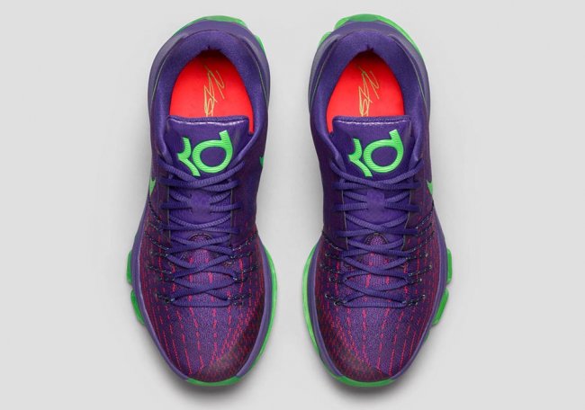 致敬杜兰特的 MVP 桂冠,以他在当晚的演讲中所穿着的紫色西装为灵感来源,此款 KD8 “Suit” 以紫色鞋身点缀绿色细节,搭配绿色外底。鞋面细节的鞋垫的猩红色反衬则凸显亮点,将于 8 月 14 日正式发售。 货号:749375-535 发售日期:8 月 14 日