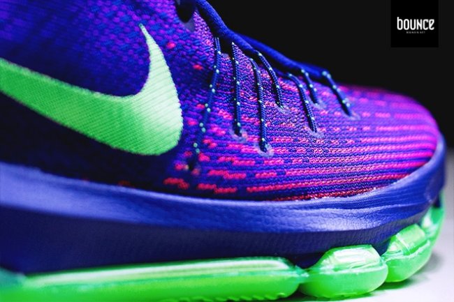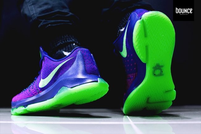 杜兰特荣获 MVP,并将荣耀和成绩献给自己的母亲,这一感人场景依然历历在目。致敬杜兰特的 MVP 桂冠,以当晚他所穿着的紫色西装为灵感来源,在 KD8 鞋身上带来一款紫绿搭配点缀猩红细节的全新配色。KD8 “Suit” 抢眼的整体视觉体验也展现了杜兰特的巨星风采,无论是远观还是近赏,都颇值得细细品味。 货号:800259-535 发售日期:8 月 14 日