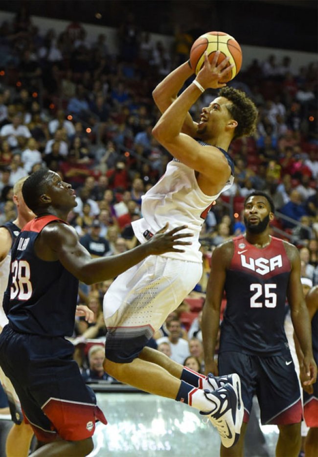 美国男篮各精英成员聚集拉斯维加斯进行集训,昨天进行的队内比赛给现场观众带来了一场精彩的表演,而场上各式各样的球鞋上脚依然是不容错过的靓丽风景线,各大品牌全新的 USA 美国国家队配色也纷纷亮相。