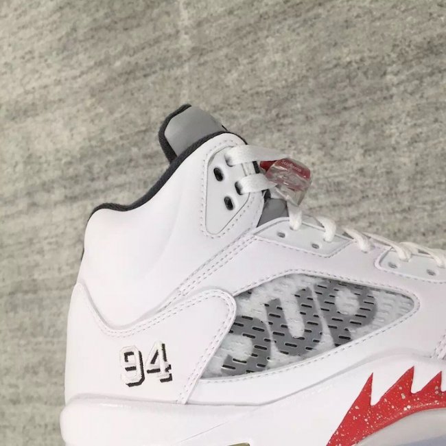 带来白色版本的 Supreme x Air Jordan 5 “White” 的实物美拍近赏。 白色皮革鞋面搭配银灰 3M 鞋舌,中底的火红喷炎装扮颇为抢眼,鞋帮 94 刺绣和 Sup 字样则表明了它的身份。 清爽的整体感受,白色鞋身的活力显现,带来同前两款配色不同的体验。