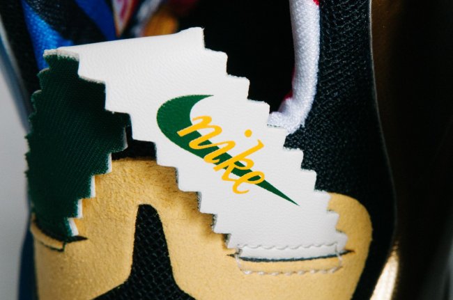 Safari 纹理首次出现在 LeBron 12 中,中底泼墨装扮让人想起 Air Tech Challenge II,后跟鞋底的 Nike 复古 Logo 也颇有趣味,黄绿色搭配也颇有 Oregon Ducks 风范。