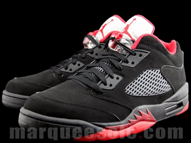 质感十足的黑色牛巴革鞋面,辅以鲜红色的内衬和中底喷炎装扮,五代鞋款最为经典的银灰 3M 鞋舌和红色 Jumpman Logo 则进一步增添了它的诱人魅力。