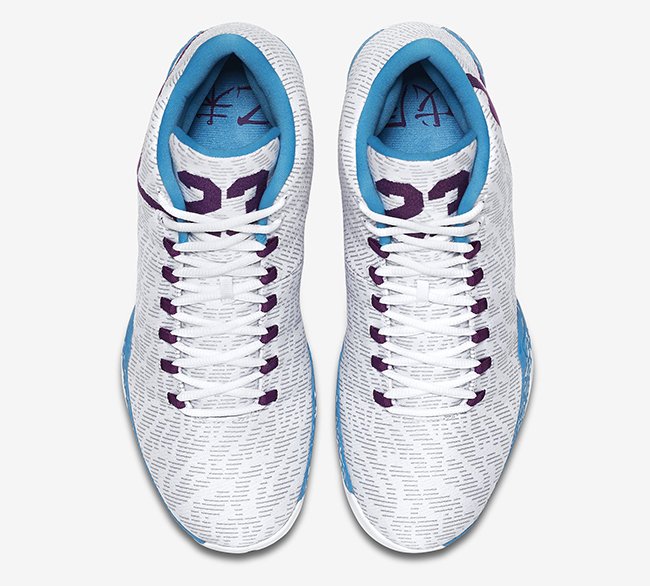 此款 Air Jordan XX9 风水配色以白色鞋面点缀灰色暗纹,以紫色的硕大 Jumpman Logo 和鞋舌 23 字样呈现,搭配水绿内衬和中底。鞋垫上依然有戊辰和乙未字样,其中戊辰年为 1988 年,而乙未年为 2015 年。