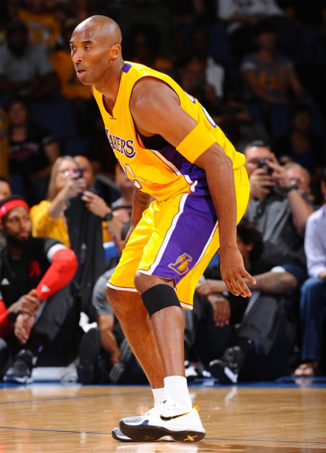 在训练赛中科比亲着曝光的深浅灰白配色 Kobe 10 Elite 颇为引人注目,深灰鞋头浅灰鞋身,辅以白色鞋帮,在市售版的贝多芬配色基础上,带来更为丰富的层次感受,上脚的视觉体验也更为特别。 科比在季前赛中则上脚了一款有所不同的低帮版 Kobe 10 Elite Low 灰白配色,基本色调同前款一致,灰色鞋头辅以白色鞋身,搭配黑色的 Swoosh。