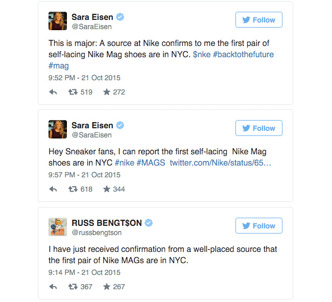 Nike Air Mag 在近两天刷爆了球鞋圈,Nike 不仅带来了回到未来电影中主角上脚的 Nike Bruin,品牌的官方 Twitter 账号还带来了更多的信息。