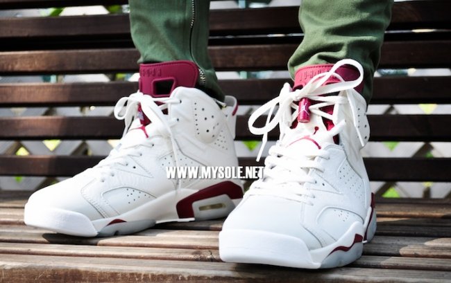 首次发售于 1991 年,Air Jordan 6 “Maroon” 的白鞋装扮,注入抢眼红色点缀,加之乔帮主的亲着上脚,都为其增添了不少的看点,目前的关注度也颇为可观。