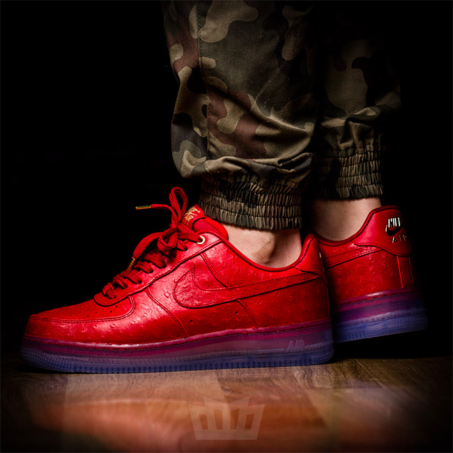 Air Force 1 Low 低帮鞋型带来一款全新的惊艳配色,同今年亮相的高帮鞋款颇为相似,此款 Nike Air Force 1 Low CMFT LUX 以全红鞋面辅以蓝水晶外底,细节则同样注入金色点缀。 皮革鞋面的特殊细节装饰,金色细节的奢华体验,上脚效果带来十足的视觉冲击力。 货号:805300-600