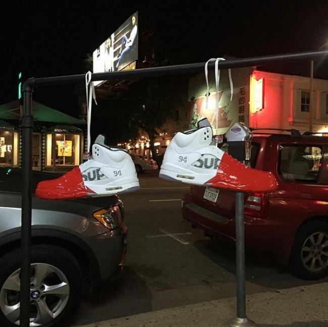 于是他将球鞋直接放进红色油漆中,拿出来晾干之后竟然收获了出人意料的视觉效果,同 Supreme Box Logo 有了异曲同工之妙。