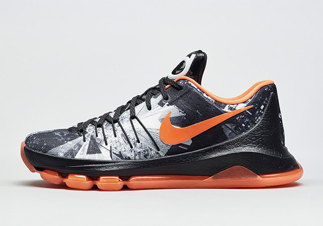 杜兰特战靴 KD8 “Opening Night” 则以俄克拉荷马城的城市景观图案呈现,黑白的精致鞋面辅以橙色的细节装饰,将在对阵马刺的首战中亮相。