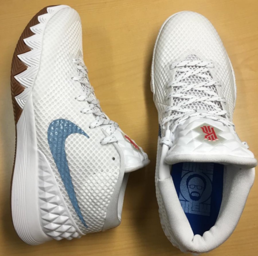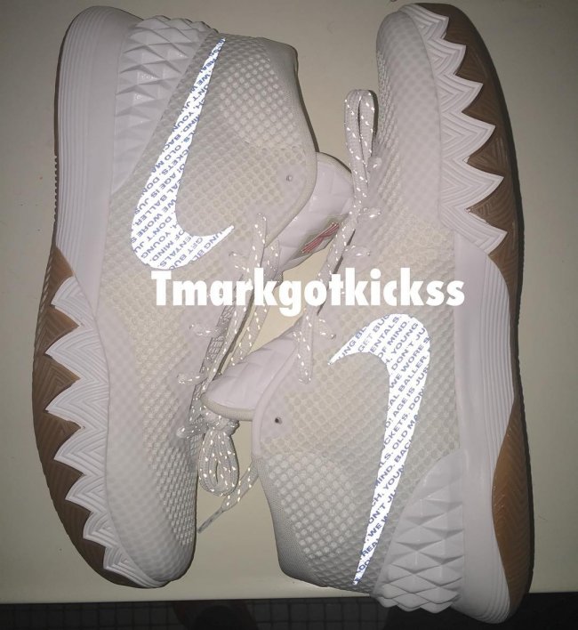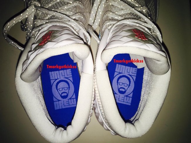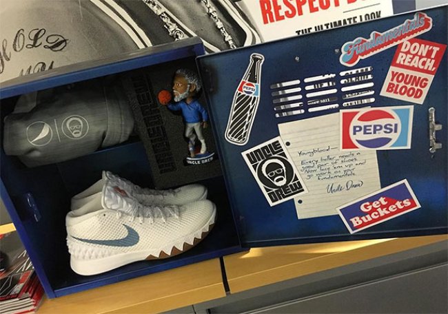 以凯里欧文扮演的经典百事广告人物德鲁大叔为主题,此款 Nike Kyrie 1 “Uncle Drew” 在今年早些时候已经曝光,现在带来更多消息。 广告场景 并非之前传言的仅之作了 2 双,而是限量 150 双,以白色鞋身装饰带有 3M 反光效果的 Swoosh,鞋舌则以立体几何呈现,选以生胶外底托衬。鞋垫上带有 Uncle Drew 头像,鞋带、Swoosh 的反光效果和精致表现让人颇为惊叹。 伴随鞋款的还有一个精致的礼盒,此款配色不会进行市售,想入手的朋友可能要费点心思了。