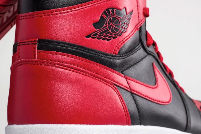 1)完美再现 Air Jordan 1 “Bred” 黑红 1 的鞋身装扮,黑红色彩的选择和拼接方式,与黑红 1 同出一辙。公牛队黑红配色完美再现,这款配色在 Bred 球鞋的清单中恐怕也是位列前排的。