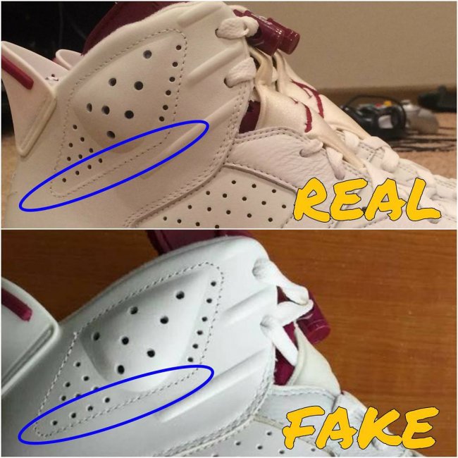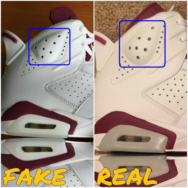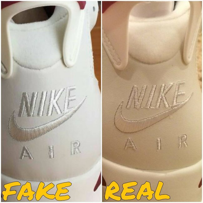 fake_education 又为大家带来福利,Nike Air 后跟 Air Jordan 6 “Maroon” 魔力红配色即将登场,白红活力装扮带来经典的 Nike Air 刺绣后跟,已经吸引了超高的关注度,必定也将成为假鞋泛滥的重灾区。 此番他带来真假实物细节对比,还请大家在购鞋的过程中注意。