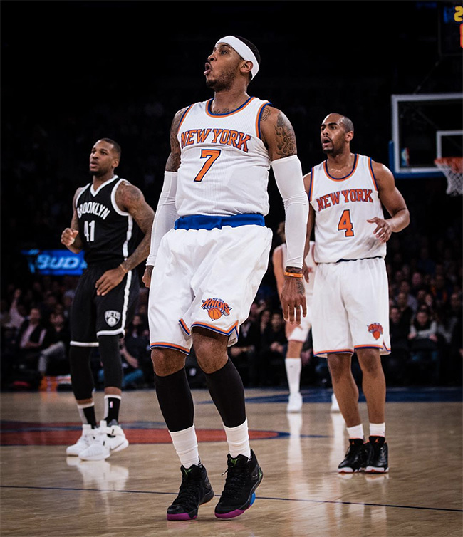 安东尼在对阵网队的比赛中,上脚了这款最新的 Jordan Melo M12。新鞋亮相,也给尼克斯带来了好运!