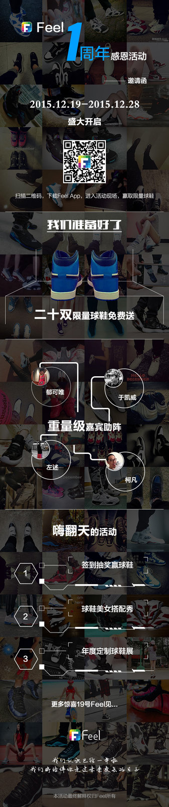 Feel铭记着初见时的美好,20双限量球鞋将在12月19日Feel一周年活动上免费送出,只需要登录Feel运动交友App签到即可参与抽奖,限量球鞋拿到手软!