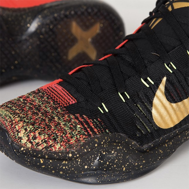 将于 26 日正式在中国区发售,Kobe 10 Elite Low “Xmas” 以丰富的视觉体验,展现了黑曼巴的荣耀历程,而 Flyknit 编织鞋身的多彩鞋头,以及中底的黑金泼墨装扮,则进一步凸显精致氛围。