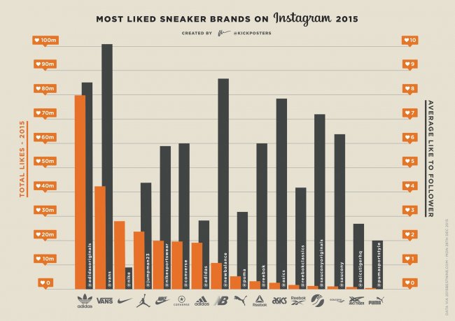 Kanye West 和 adidas Yeezy 无疑是 2015 年 Sneaker 球鞋市场的最大赢家。KickPosters 根据图片社交网络 Instagram 的数据,统计出被 “Like” 点赞的球鞋品牌排行。