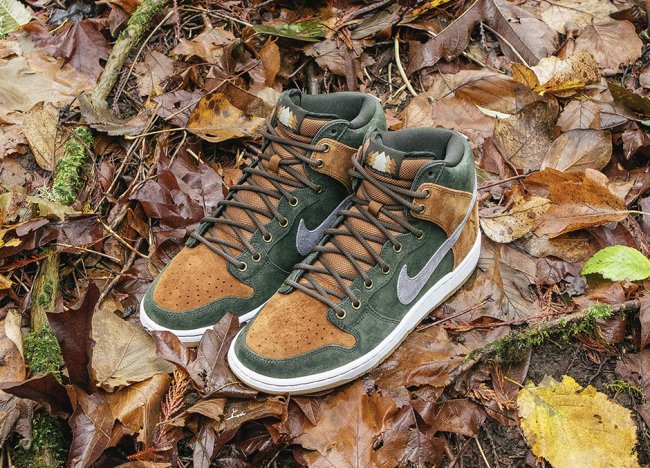Nike SB x Homegrown Skateshop 滑板鞋以纽约伊萨卡市为灵感,采用经典款型,并且设计元素尽数汲取了当地葱郁林木地貌和优美自然景观中的精髓。坚固耐磨的全猪皮翻毛皮鞋面、风格低调的拼色设计、源自登山鞋的鞋带配置、以及出自店铺元老级成员 Jesse Hill 的插画创作,悉数传达户外主题,简洁的美学设计则忠实复刻 Dunk 系列的经典线条元素。