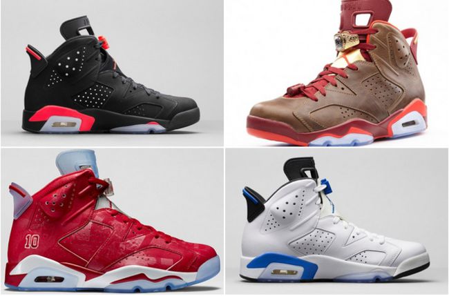 作为乔丹本人第一个三连冠开始的球鞋,Air Jordan 6 承载着太多太多球鞋爱好者的回忆。很多人第一次接触它就是在漫画(或动画)《灌篮高手》里。经典的配色如 Air Jordan 6 黑红,白红,白兰,胭脂,魔力红等等。2010 年发售的 Air Jordan 6 红外线套装(黑红及白红)可谓最经典。发售以及复刻众多的配色,也是 Jordan Brand 圈钱的手段之一,当然不要提那个什么 “巴西套装”。
