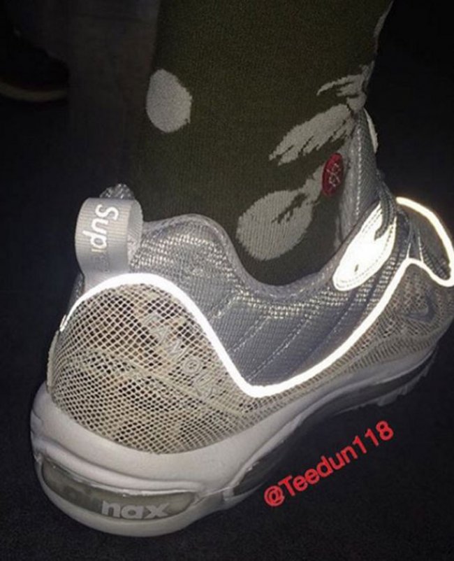 Supreme 继续带来同 Nike 的联名鞋款,此番携手 Nike Sportswear,在 Air Max 98 鞋型基础上带来全新联名配色。此番曝光了两款配色,分别以白色和黑色鞋身呈现,细节则以蛇纹和漆皮注入,3M 反光元素的加入也获得了亮眼的视觉效果。 从鞋垫标识和后跟鞋提上我们可以看出 Supreme 的联名身份,目前尚无发售信息,我们将持续关注。