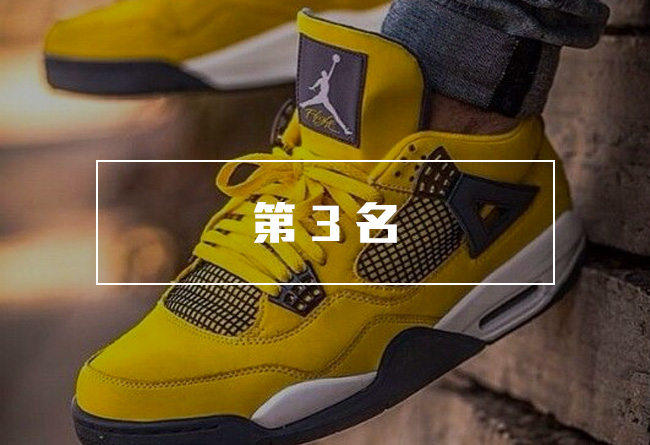 第三名是 Air Jordan 4,不知同今年 4 代鞋型大放异彩,带来多款配色的发售是否有关系。不过继承了 3 代的经典,Air Jordan 4 经久不衰的运动外观,哪怕是今天,也百看不厌。而拥有众多天价的稀有配色,恐怕也能说明一些问题。