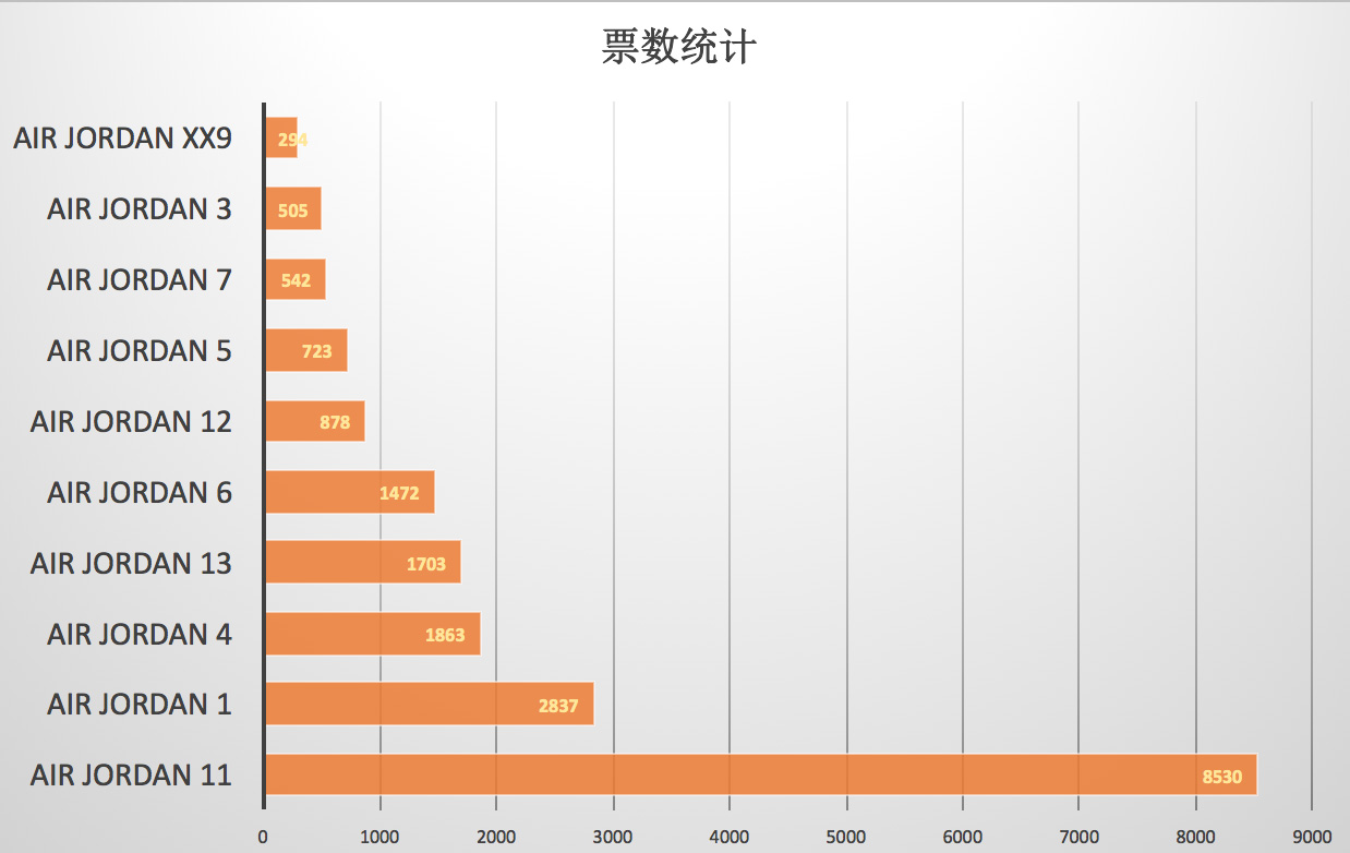 一共有 20575 名 Sneakerhead 参与了投票,由于是单选,所以每人只有一票的机会,只能投给自己心目中的最佳 No.1。我们统计了超过 200 票的选项,一共刚好有 10 双球鞋进入名单,也就是投票数低于总体 1% 的选项将被过滤。本次的单选投票,反映的更多是大家心目中的 “真爱”,并不能代表没有进入名单就不是热门。
